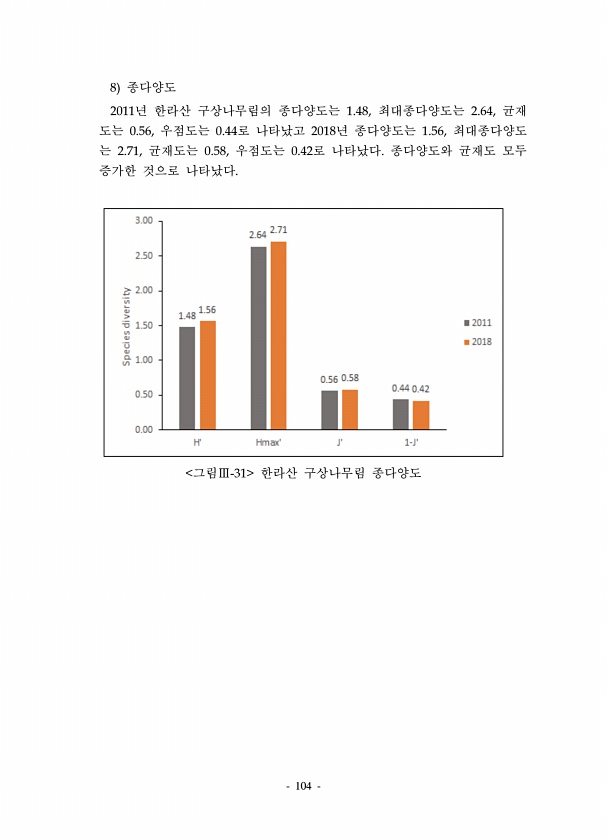 104 8 종다양도 2011년 한라산 구상나무림의 종다양도는 1.48, 최대종다양도는 2.64, 균재 도는 0.56, 우점도는 0.44로 나타났고 2018년 종다양도는 1.56, 최대종다양도 는 2.71, 균재도는 0.58, 우점도는 0.42로 나타났다. 종다양도와 균재도 모두 증가한 것으로 나타났다. 그림Ⅲ-31 한라산 구상나무림종다양도