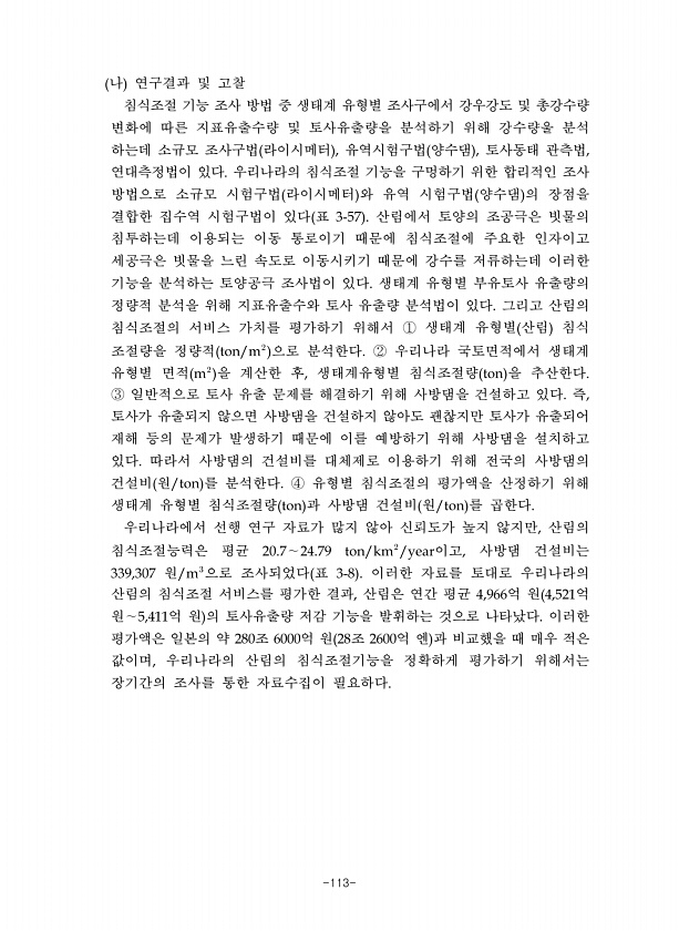 -113- 나 연구결과 및 고찰 침식조절 기능 조사 방법 중 생태계 유형별 조사구에서 강우강도 및 총강수량 변화에 따른 지표유출수량 및 토사유출량을 분석하기 위해 강수량울 분석 하는데 소규모 조사구법 라이시메터 유역시험구법 양수댐 토사동태 관측법 연대측정법이 있다 우리나라의 침식조절 기능을 구멍하기 위한 합리적인 조사 방법으로 소규모 시험구법 라이시메터 와 유역 시험구법 양수댐 의 장점을 결합한 집수역 시험구법이 있다 표 산림에서 토양의 조공극은 빗물의 침투하는데 이용되는 이동 통로이기 때문에 침식조절에 주요한 인자이고 세공극은 빗물을 느린 속도로 이동시키기 때문에 강수를 저류하는데 이러한 기능을 분석하는 토양공극 조사법이 있다 생태계 유형별 부유토사 유출량의 정량적 분석을 위해 지표유출수와 토사 유출량 분...