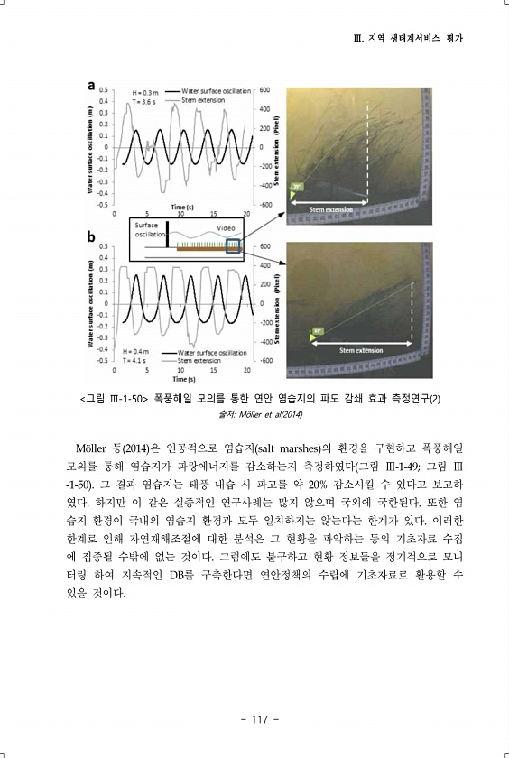 Ⅲ. 지역 생태계서비스 평가 117 그림 Ⅲ-1-50 폭풍해일 모의를 통한 연안 염습지의 파도 감쇄 효과 측정연구 2 출처M?ller et al 2014 M?ller 등 2014 은 인공적으로 염습지 salt marshes 의 환경을 구현하고 폭풍해일 모의를 통해 염습지가 파랑에너지를 감소하는지 측정하였다 그림 Ⅲ-1-49; 그림 Ⅲ -1-50 그 결과 염습지는 태풍 내습 시 파고를 약 20% 감소시킬 수 있다고 보고하 였다. 하지만 이 같은 실증적인 연구사례는 많지 않으며 국외에 국한된다. 또한 염 습지 환경이 국내의 염습지 환경과 모두 일치하지는 않는다는 한계가 있다. 이러한 한계로 인해 자연재해조절에 대한 분석은 그 현황을 파악하는 등의 기초자료 수집 에 집중될 수밖에 없는 것이다. 그럼에도 불구하고 ...