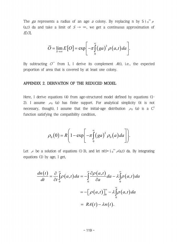 119 The ga represents a radius of an age a colony. By replacing n by S∫0∞ρ a,t da and take a limit of S → ∞, we get a continuous approximation of E [O], [ ] 2 0 lim exp , S O E O ga a t da ? ? p r ® ? ? = = ? ? ? ? ? By subtracting O ? from 1, I derive its complement A t , i.e., the expected proportion of area that is covered by at least one colony. APPENDIX 2. DERIVATION OF THE REDUCED MODEL Here...