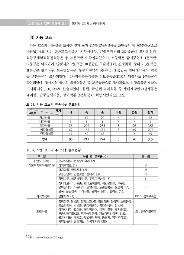 2017 DMZ 일원 생태계 조사 민통선이북지역 서부평야권역 124 ? National Institute of Ecology 3 사동 코스 사동 코스의 식물상을 조사한 결과 86과 217속 274종 3아종 28변종의 총 305분류군으로 나타났다 표 31 한반도고유종은 은사시나무, 큰꽃땅비싸리 2분류군이 조사되었다. 식물구계학적특정식물은 총 24분류군이 확인되었으며, Ⅴ등급은 삼지구엽초 1분류군, Ⅳ등급은 낙지다리, 양뿔사초 2분류군, Ⅲ등급은 구슬갓냉이, 긴병꽃풀, 중나리 3분류군, Ⅱ등급은 황벽나무, 붉은병꽃나무, 두루미천남서 3분류군, Ⅰ등급은 청나래고사리, 관중 등 15분류군이 조사되었다. 국가적색목록식물은 정보부족종 DD 의 양뿔사초 1분류군이 확인되었다. 조사지역 일대의 외래식물은 총 28분류군으로...
