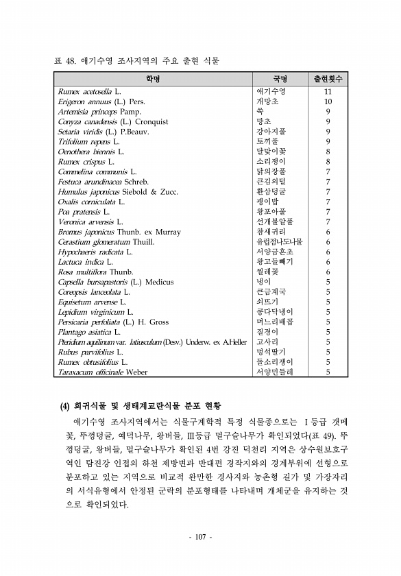 107 학명 국명 출현횟수 Rumex acetosella L. 애기수영 11 Erigeron annuus L. Pers. 개망초 10 Artemisia princeps Pamp. 쑥 9 Conyza canadensis L. Cronquist 망초 9 Setaria viridis L. P.Beauv. 강아지풀 9 Trifolium repens L. 토끼풀 9 Oenothera biennis L. 달맞이꽃 8 Rumex crispus L. 소리쟁이 8 Commelina communis L. 닭의장풀 7 Festuca arundinacea Schreb. 큰김의털 7 Humulus japonicus Siebold & Zucc. 환삼덩굴 7 Oxalis corniculata L. 괭이밥 7 Poa pratensis ...