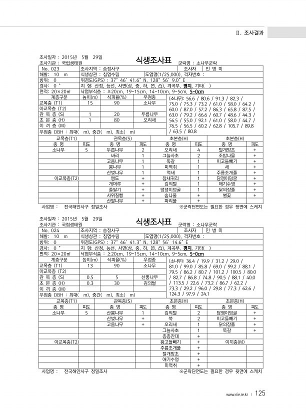 Ⅱ. 조사결과 www.nie.re.kr ? 125 조사일자 2015년 5월 29일 조사기관 국립생태원 식생조사표 군락명 소나무군락 No. 023 조사지역 송정사구 조사자 민 병 미 해발10 m 식생상관 침엽수림 도엽명 1/25,000 , 격자번호 방위0 위경도 GPS 37°46′41.6″N, 128°56′9.0″E 경사0 ° 지 형산정, 능선, 사면 상, 중, 하, 凹, 凸 , 계곡부, 평지, 기타 면적20×20㎡ 낙엽부식층 ≥20cm, 19-15cm, 14-10cm, 9-5cm, 5-0cm 계층구분 높이 m 식피율 % 우점종 소나무 56.6 80.6 91.3 82.3 75.0 75.3 73.2 61.0 58.0 64.2 60.0 87.0 57.2 86.3 65.8 87.5 63.0 79.2 66.6 60....