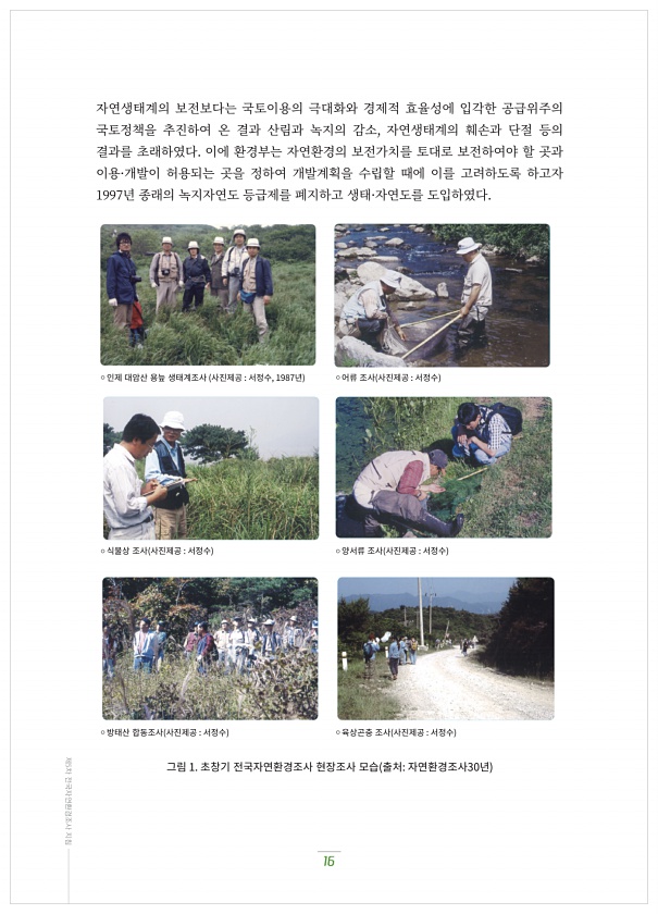 16 제5차 전국자연환경조사 지침 자연생태계의?보전보다는?국토이용의?극대화와?경제적?효율성에?입각한?공급위주의 국토정책을? 추진하여? 온? 결과? 산림과? 녹지의? 감소, 자연생태계의? 훼손과? 단절? 등의 결과를?초래하였다. 이에?환경부는?자연환경의?보전가치를?토대로?보전하여야?할?곳과 이용·개발이? 허용되는? 곳을? 정하여? 개발계획을? 수립할? 때에? 이를? 고려하도록? 하고자 ????년?종래의?녹지자연도?등급제를?폐지하고?생태·자연도를?도입하였다. 그림 1. 초창기?전국자연환경조사?현장조사?모습 출처자연환경조사30년 ○ 인제?대암산?용늪?생태계조사 사진제공 서정수, 1987년 ○ 어류?조사 사진제공 서정수 ○ 식물상?조사 사진제공 서정수 ○ 양서류?조사 사진제공 서정수 ○ 방태산?합동조사 사진제공 서...