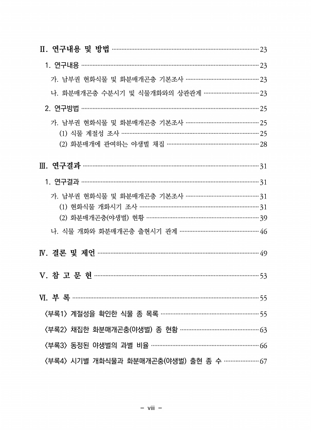 viii Ⅱ. 연구내용 및 방법 ···························································································23 1. 연구내용 ··············································································································23 가. 남부권 현화식물 및 화분매개곤충 기본조사 ·············································23 나. 화분매개곤충 수분시기 및 식물개화와의 상관관계 ··································23 2. 연구방법 ···················...