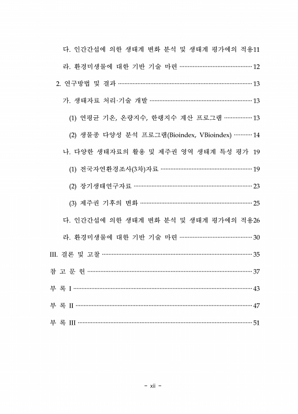 xii 다 인간간섭에 의한 생태계 변화 분석 및 생태계 평가에의 적용 라 환경미생물에 대한 기반 기술 마련 연구방법 및 결과 가 생태자료 처리 기술 개발 연평균 기온 온량지수 한랭지수 계산 프로그램 생물종 다양성 분석 프로그램 나 다양한 생태자료의 활용 및 제주권 영역 생태계 특성 평가 전국자연환경조사 차 자료 장기생태연구자료 제주권 기후의 변화 다 인간간섭에 의한 생태계 변화 분석 및 생태계 평가에의 적용 라 환경미생물에 대한 기반 기술 마련 결론 및 고찰 참 고 문 헌 부 록 부 록 부록