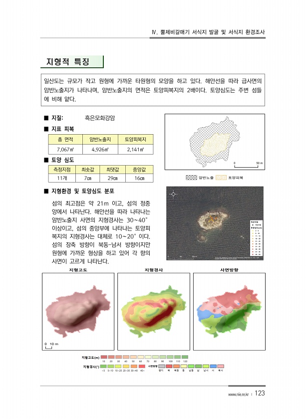 Ⅳ. 뿔제비갈매기 서식지 발굴 및 서식지 환경조사 www.nie.re.kr ? 123 지형적 특징 일산도는 규모가 작고 원형에 가까운 타원형의 모양을 하고 있다. 해안선을 따라 급사면의 암반노출지가 나타나며, 암반노출지의 면적은 토양피복지의 2배이다. 토양심도는 주변 섬들 에 비해 얕다. ■ 지질흑은모화강암 ■ 지표 피복 총 면적 암반노출지 토양피복지 7,067㎡ 4,926㎡ 2,141㎡ ■ 토양 심도 측정지점 최솟값 최댓값 중앙값 11개 7㎝ 29㎝ 16㎝ ■ 지형환경 및 토양심도 분포 섬의 최고점은 약 21m 이고, 섬의 정중 앙에서 나타난다. 해안선을 따라 나타나는 암반노출지 사면의 지형경사는 30∼40° 이상이고, 섬의 중앙부에 나타나는 토양피 복지의 지형경사는 대체로 10∼20°이다. 섬의 장축 방...