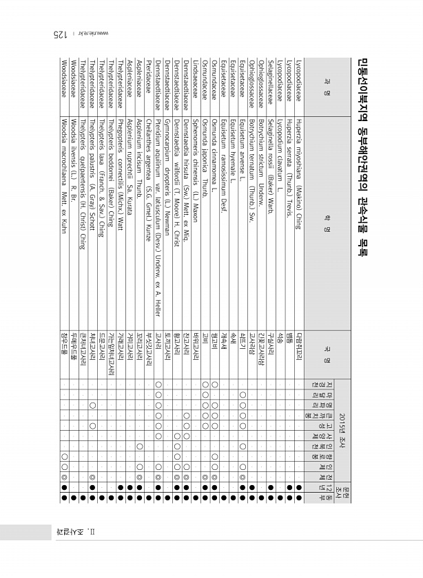125 과 명 학 명 국 명 2015년 조사 문헌 조사 지경천 마달리 명파리 큰까치봉 고성 사양제 인북천 향로봉 인제 전체 12 년 동부 Lycopodiaceae Huperzia miyoshiana Makino Ching 다람쥐꼬리 ● ● Lycopodiaceae Huperzia serrata Thunb. Trevis. 뱀톱 ● ● Lycopodiaceae Lycopodium clavatum L. 석송 ● Selaginellaceae Selaginella rossii Baker Warb. 구실사리 ● ● Ophioglossaceae Botrychium strict...