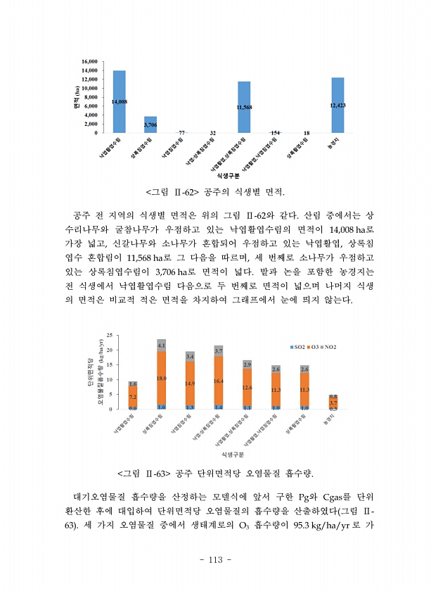 113 그림 공주의 식생별 면적. 공주 전 지역의 식생별 면적은 위의 그림 와 같다 산림 중에서는 상 수리나무와 굴참나무가 우점하고 있는 낙엽활엽수림의 면적이 로 가장 넓고 신갈나무와 소나무가 혼합되어 우점하고 있는 낙엽활엽 상록침 엽수 혼합림이 로 그 다음을 따르며 세 번째로 소나무가 우점하고 있는 상록침엽수림이 로 면적이 넓다 밭과 논을 포함한 농경지는 전 식생에서 낙엽활엽수림 다음으로 두 번째로 면적이 넓으며 나머지 식생 의 면적은 비교적 적은 면적을 차지하여 그래프에서 눈에 띄지 않는다 그림 공주 단위면적당 오염물질 흡수량 대기오염물질 흡수량을 산정하는 모델식에 앞서 구한 와 를 단위 환산한 후에 대입하여 단위면적당 오염물질의 흡수량을 산출하였다 그림 세 가지 오염물질 중에서 생태계로의 흡수량이 로가