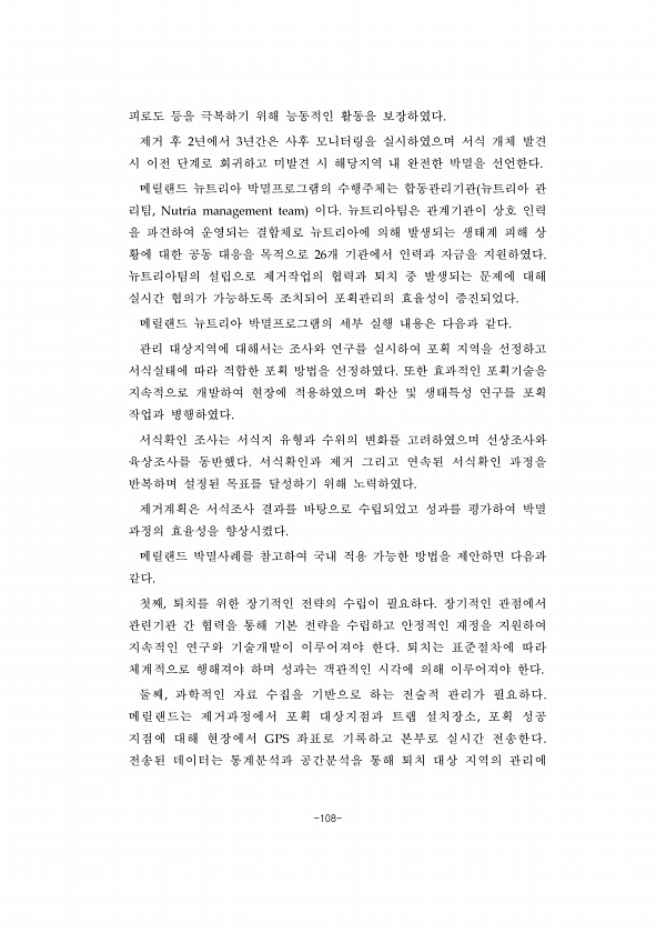 -108- 피로도 등을 극복하기 위해 능동적인 활동을 보장하였다. 제거 후 2년에서 3년간은 사후 모니터링을 실시하였으며 서식 개체 발견 시 이전 단계로 회귀하고 미발견 시 해당지역 내 완전한 박멸을 선언한다. 메릴랜드 뉴트리아 박멸프로그램의 수행주체는 합동관리기관 뉴트리아 관 리팀, Nutria management team 이다. 뉴트리아팀은 관계기관이 상호 인력 을 파견하여 운영되는 결합체로 뉴트리아에 의해 발생되는 생태계 피해 상 황에 대한 공동 대응을 목적으로 26개 기관에서 인력과 자금을 지원하였다. 뉴트리아팀의 설립으로 제거작업의 협력과 퇴치 중 발생되는 문제에 대해 실시간 협의가 가능하도록 조치되어 포획관리의 효율성이 증진되었다. 메릴랜드 뉴트리아 박멸프로그램의 세부 실행 내용은 다음과 같다. ...