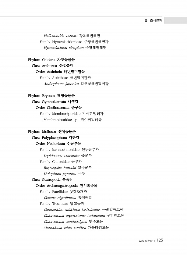 Ⅱ. 조사결과 www.nie.re.kr ? 125 Hailchondria oshoro 황록해변해면 Family Hymeniacidonidae 주황해변해면과 Hymeniacidon sinapium 주황해변해면 Phylum Cnidaria 자포동물문 Class Anthozoa 산호충강 Order Actiniaria 해변말미잘목 Family Actiniidae 해변말미잘과 Anthopleura japonica 갈색꽃해변말미잘 Phylum Bryozoa 태형동물문 Class Gymnolaemata 나후강 Order Cheilostomata 순구목 Family Membraniporidae 막이끼벌레과 Membraniporidae sp. 막이끼벌레류 Phylum Mollusca 연체동물문 Class Polyplacop...