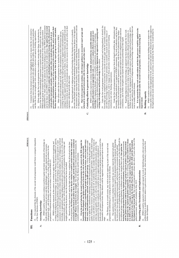 IPBES/6/11 III. Functions 15. It is expected that the elements of the second work programme would foster a synergetic integration of the four functions of IPBES. A. Assessing knowledge 16. IPBES would be expected to continue to perform regular and timely assessments of knowledge on biodiversity and ecosystem services and their interlinkages ? at a global, regional and, as necessary, subregional sc...