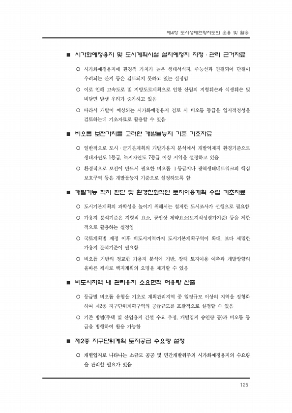 제4장 도시생태현황지도의 운용 및 활용 125 n 시가화예정용지 및 도시계획시설 설치예정지 지정ㆍ관리 근거자료 ¡ 시가화예정용지에 환경적 가치가 높은 생태서식지, 주능선과 연결되어 단절이 우려되는 산지 등은 검토되지 못하고 있는 실정임 ¡ 이로 인해 고속도로 및 지방도로계획으로 인한 산림의 지형훼손과 식생훼손 및 비탈면 발생 우려가 증가하고 있음 ¡ 따라서 개발이 예상되는 시가화예정용지 검토 시 비오톱 등급을 입지적정성을 검토하는데 기초자료로 활용할 수 있음 n 비오톱 보전가치를 고려한 개발불능지 기준 기초자료 ¡ 일반적으로 도시ㆍ군기본계획의 개발가용지 분석에서 개발억제지 환경기준으로 생태자연도 1등급, 녹지자연도 7등급 이상 지역을 설정하고 있음 ¡ 환경적으로 보전이 반드시 필요한 비오톱 Ⅰ등급지나 광역생...