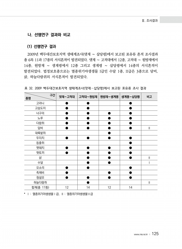 Ⅱ. 조사결과 www.nie.re.kr ? 125 나. 선행연구 결과와 비교 1 선행연구 결과 2009년 백두대간보호지역 생태계조사 댓재 ∼ 삽당령 에서 보고된 포유류 흔적 조사결과 총 6목 11과 17종의 서식흔적이 발견되었다. 댓재 ∼ 고적대에서 12종, 고적대 ∼ 원방재에서 14종, 원방재 ∼ 생계령에서 12종 그리고 생계령 ∼ 삽당령에서 14종의 서식흔적이 발견되었다. 법정보호종으로는 멸종위기야생생물 I급인 수달 1종, II급은 3종으로 담비, 삵, 하늘다람쥐의 서식흔적이 발견되었다. 구간 종명 댓재∼고적대 고적대∼원방재 원뱡재∼생계령 생계령∼삽당령 비고 고라니 ● ● ● 고슴도치 ● ● ● 너구리 ● ● ● ● 노루 ● ● ● ● 다람쥐 ● ● ● ● 담비 ● ● ● ● Ⅱ 대륙밭쥐 ● 두더지 ● ...