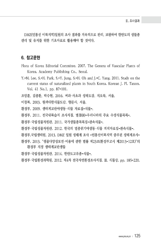 Ⅱ. 조사결과 www.nie.re.kr ? 125 DMZ 민통선 이북지역 일원의 조사 결과를 지속적으로 관리, 보완하여 한반도의 생물종 관리 및 유지를 위한 기초자료로 활용해야 할 것이다. 6. 참고문헌 Flora of Korea Editorial Commitee. 2007. The Genera of Vascular Plants of Korea. Academy Publishing Co., Seoul. Y.-M. Lee, S.-H. Park, S.-Y. Jung, S.-H. Oh and J.-C. Yang. 2011. Study on the current status of naturalized plants in South Korea. Korean J. Pl. Taxon. Vol. 41 No.1, pp. 87-...