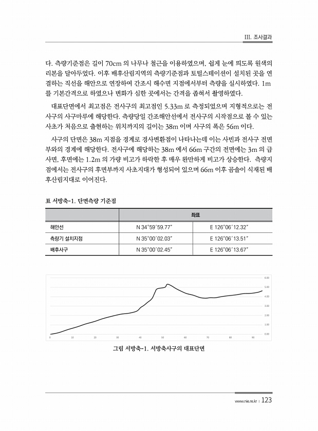 III. 조사결과 www.nie.re.kr ?123 다. 측량기준점은 길이 70cm 의 나무나 철근을 이용하였으며, 쉽게 눈에 띄도록 원색의 리본을 달아두었다. 이후 배후산림지역의 측량기준점과 토털스테이션이 설치된 곳을 연 결하는 직선을 해안으로 연장하여 간조시 해수면 지점에서부터 측량을 실시하였다. 1m 를 기본간격으로 하였으나 변화가 심한 곳에서는 간격을 좁혀서 촬영하였다. 대표단면에서 최고점은 전사구의 최고점인 5.33m 로 측정되었으며 지형적으로는 전 사구의 사구마루에 해당한다. 측량당일 간조해안선에서 전사구의 시작점으로 볼 수 있는 사초가 처음으로 출현하는 위치까지의 길이는 38m 이며 사구의 폭은 56m 이다. 사구의 단면은 38m 지점을 경계로 경사변환점이 나타나는데 이는 사빈과 전사구 전면 부...