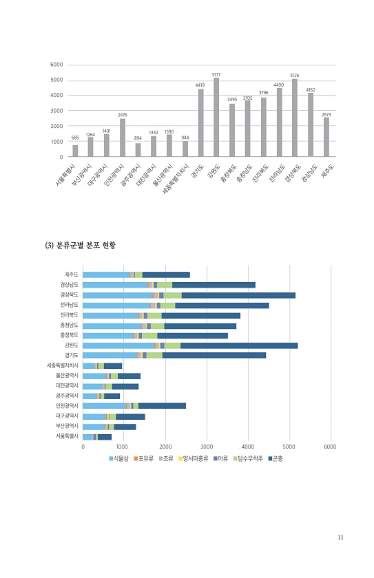 11 3 분류군별 분포 현황 서울특별시 부산광역시 대구광역시 인천광역시 광주광역시 대전광역시 울산광역시 세종특별자치시 경기도 강원도 충청북도 충청남도 전라북도 전라남도 경상북도 경상남도 제주도 6000 5000 4000 3000 2000 1000 0 1264 685 1491 2476 894 1332 1390 944 4419 5177 3495 3705 3796 4490 5126 4162 2573 0 1000 2000 3000 4000 5000 6000 ■식물상 ■포유류 ■조류 ■양서파충류 ■어류 ■담수무척추 ■곤충 제주도 경상남도 경상북도 전라남도 전라북도 충청남도 충청북도 강원도 경기도 세종특별자치시 울산광역시 대전광역시 광주광역시 인천광역시 대구광역시 부산광역시서울특별시