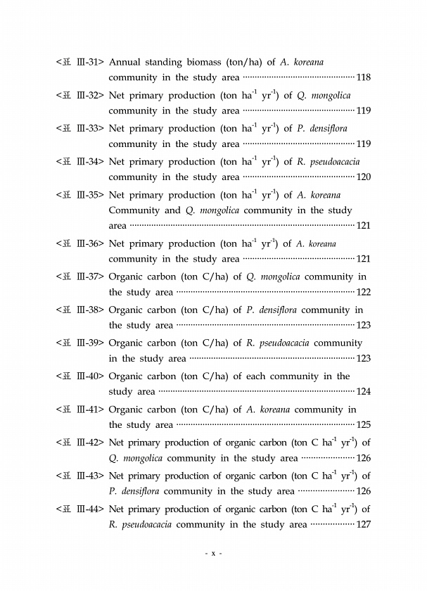 x 표 Ⅲ-31 Annual standing biomass ton/ha of A. koreana community in the study area ···············································118 표 Ⅲ-32 Net primary production ton ha-1 yr-1 of Q. mongolica community in the study area ···············································119 표 Ⅲ-33 Net primary production ton ha-1 yr-1 of P. densiflora community in the study area ·······································...