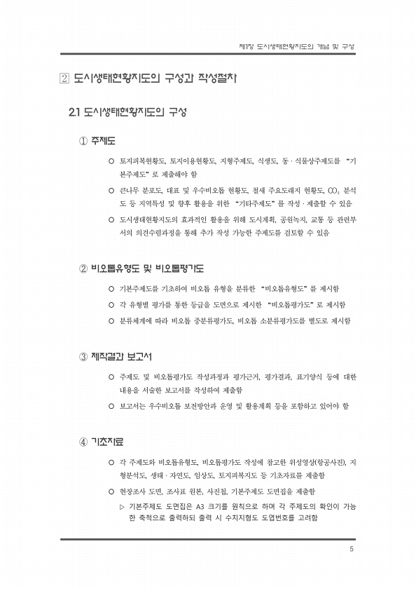 제1장 도시생태현황지도의 개념 및 구성 5 도시생태현황지도의 구성과 작성절차 2.1 도시생태현황지도의 구성 ① 주제도 ¡ 토지피복현황도, 토지이용현황도, 지형주제도, 식생도, 동ㆍ식물상주제도를 “기 본주제도”로 제출해야 함 ¡ 큰나무 분포도, 대표 및 우수비오톱 현황도, 철새 주요도래지 현황도, CO₂분석 도 등 지역특성 및 향후 활용을 위한 “기타주제도”를 작성ㆍ제출할 수 있음 ¡ 도시생태현황지도의 효과적인 활용을 위해 도시계획, 공원녹지, 교통 등 관련부 서의 의견수렴과정을 통해 추가 작성 가능한 주제도를 검토할 수 있음 ② 비오톱유형도 및 비오톱평가도 ¡ 기본주제도를 기초하여 비오톱 유형을 분류한 “비오톱유형도”를 제시함 ¡ 각 유형별 평가를 통한 등급을 도면으로 제시한 “비오톱평가도”로 제시함 ¡ 분...