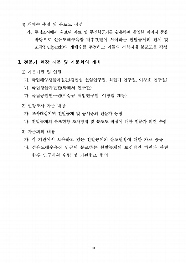 10 4 개체수 추정 및 분포도 작성 가. 현장조사에서 확보된 자료 및 무인항공기를 활용하여 촬영한 이미지 등을 바탕으로 선유도해수욕장 배후갯벌에 서식하는 흰발농게의 전체 및 조각집단 patch 의 개체수를 추정하고 이들의 서식지내 분포도를 작성 3. 전문가 현장 자문 및 자문회의 개최 1 자문기관 및 인원 가. 국립해양생물자원관 김민섭 선임연구원, 최현기 연구원, 이창호 연구원 나. 국립생물자원관 박태서 연구관 다. 국립공원연구원 이상규 책임연구원, 이창일 계장 2 현장조사 자문 내용 가. 조사대상지역 흰발농게 및 공서종의 전문가 동정 나. 흰발농게의 분포현황 조사방법 및 분포도 작성에 대한 전문가 의견 수렴 3 자문회의 내용 가. 각 기관에서 보유하고 있는 흰발농게의 분포현황에 대한 자료 공유 나. 선유...