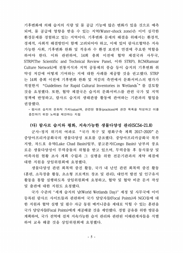 5 기후변화에 의해 습지의 식량 및 물 공급 기능에 많은 변화가 있을 것으로 예측 되며, 물 공급에 영향을 받을 수 있는 지역 Water-shock zone 은 이미 심각한 환경문제를 경험하고 있는 지역이다. 기후변화 문제의 해결을 위해서는 환경적, 경제적, 사회적 해결방안이 함께 고려되어야 하고, 이에 있어 람사르협약은 지속 가능한 사회, 기후변화 완화 및 적응과 수 환경 보전의 연결에 주요한 역할을 하여야 한다. 이와 관련하여, 14회 총회 이전에 협약 체결국과 사무국, STRP The Scientific and Technical Review Panel, 이하 STRP , RCN Ramsar Culture Network 에 전통지식과 지역 공동체의 풍습 등이 습지의 기후변화 취 약성 저감에 어떻게 기여하...