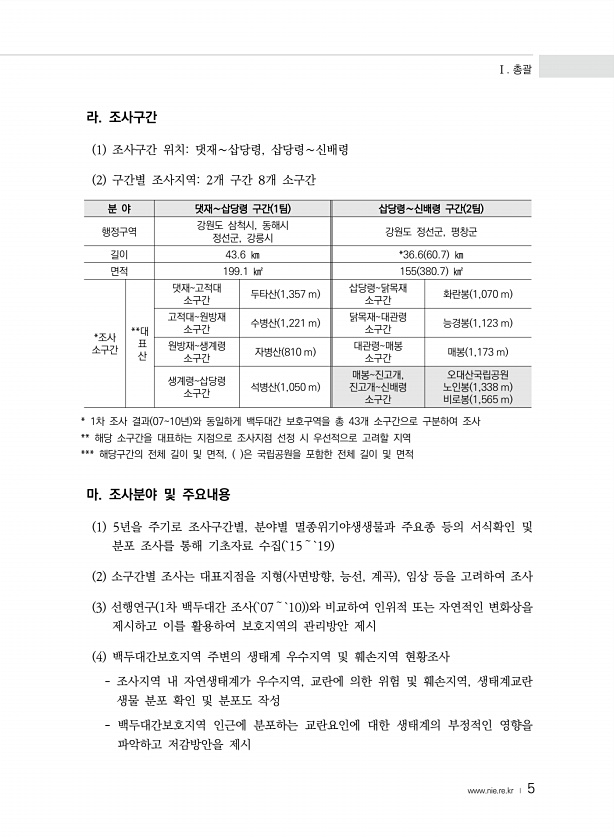Ⅰ. 총괄 www.nie.re.kr ? 5 라. 조사구간 1 조사구간 위치댓재∼삽당령, 삽당령∼신배령 2 구간별 조사지역2개 구간 8개 소구간 분 야 댓재∼삽당령 구간 1팀 삽당령∼신배령 구간 2팀 행정구역 강원도 삼척시, 동해시 정선군, 강릉시 강원도 정선군, 평창군 길이 43.6 ㎞ *36.6 60.7 ㎞ 면적 199.1 ㎢ 155 380.7 ㎢ *조사 소구간 **대 표 산 댓재고적대 소구간 두타산 1,357 m 삽당령닭목재 소구간 화란봉 1,070 m 고적대원방재 소구간 수병산 1,221 m 닭목재대관령 소구간 능경봉 1,123 m 원방재생계령 소구간 자병산 810 m 대관령매봉 소구간 매봉 1,173 m 생계령삽당령 소구간 석병산 1,050 m 매봉진고개, 진고개신배령 소구간 오대산국립공원 노인봉 1...