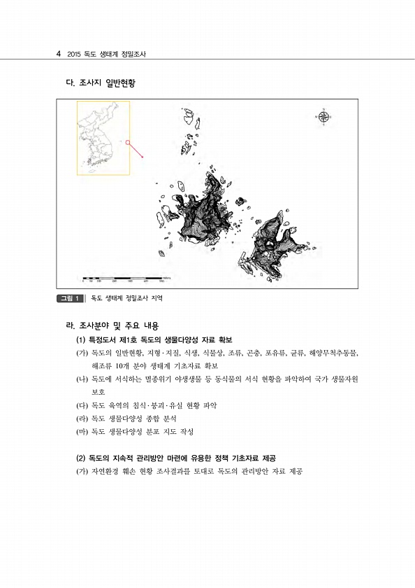 4 2015 독도 생태계 정밀조사 다. 조사지 일반현황 그림 1 독도 생태계 정밀조사 지역 라. 조사분야 및 주요 내용 1 특정도서 제1호 독도의 생물다양성 자료 확보 가 독도의 일반현황, 지형 ? 지질, 식생, 식물상, 조류, 곤충, 포유류, 균류, 해양무척추동물, 해조류 10개 분야 생태계 기초자료 확보 나 독도에 서식하는 멸종위기 야생생물 등 동식물의 서식 현황을 파악하여 국가 생물자원 보호 다 독도 육역의 침식 ? 붕괴 ? 유실 현황 파악 라 독도 생물다양성 종합 분석 마 독도 생물다양성 분포 지도 작성 2 독도의 지속적 관리방안 마련에 유용한 정책 기초자료 제공 가 자연환경 훼손 현황 조사결과를 토대로 독도의 관리방안 자료제공