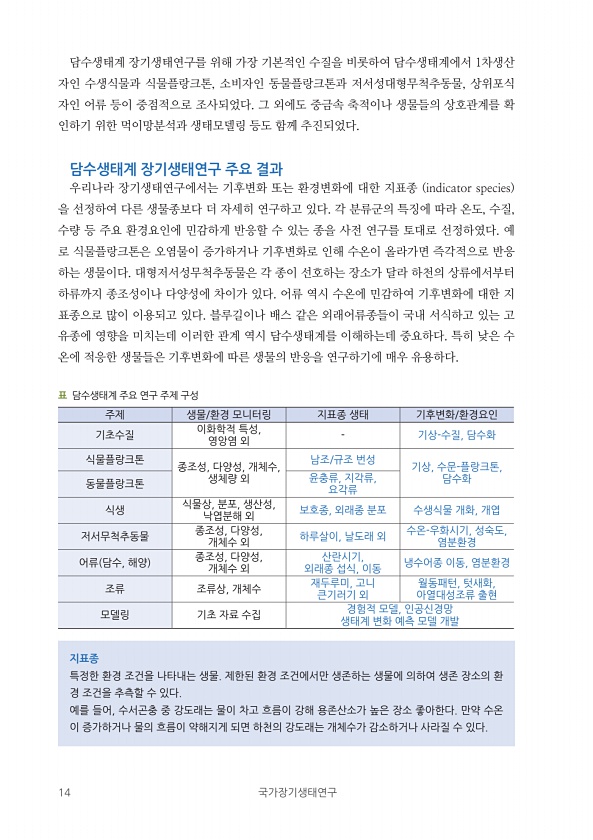14 국가장기생태연구 담수생태계 장기생태연구를 위해 가장 기본적인 수질을 비롯하여 담수생태계에서 1차생산 자인 수생식물과 식물플랑크톤, 소비자인 동물플랑크톤과 저서성대형무척추동물, 상위포식 자인 어류 등이 중점적으로 조사되었다. 그 외에도 중금속 축적이나 생물들의 상호관계를 확 인하기 위한 먹이망분석과 생태모델링 등도 함께 추진되었다. 담수생태계 장기생태연구 주요 결과 우리나라 장기생태연구에서는 기후변화 또는 환경변화에 대한 지표종 indicator species 을 선정하여 다른 생물종보다 더 자세히 연구하고 있다. 각 분류군의 특징에 따라 온도, 수질, 수량 등 주요 환경요인에 민감하게 반응할 수 있는 종을 사전 연구를 토대로 선정하였다. 예 로 식물플랑크톤은 오염물이 증가하거나 기후변화로 인해 수온이 ...