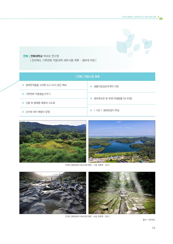 [ 전북 ] 적응사업 목록 ? 생태면적율을 고려한 도시 녹지 공간 확보 ? 기후변화 적응형숲가꾸기 ? 산불 및 병해충 예찰의 고도화 ? 산사태 대비 예방단 운영 전북┃전북대학교 박비오 연구원 [ 전라북도 기후변화 적응대책 세부시행 계획 생태계 부문] 지자체 생태분야 기후적응 지식 기반과 발전 방향 ? 생물다양성관리계약 지원 ? 생태계교란 및 유해 야생동물 모니터링 ? 1 시군 1 생태관광지 육성 [ 전북 ] 생태관광지 육성사업 왼쪽 고창, 오른쪽 군산 [ 전북 ] 생태관광지 육성사업 왼쪽 순창, 오른쪽 장수 출처 전라북도15