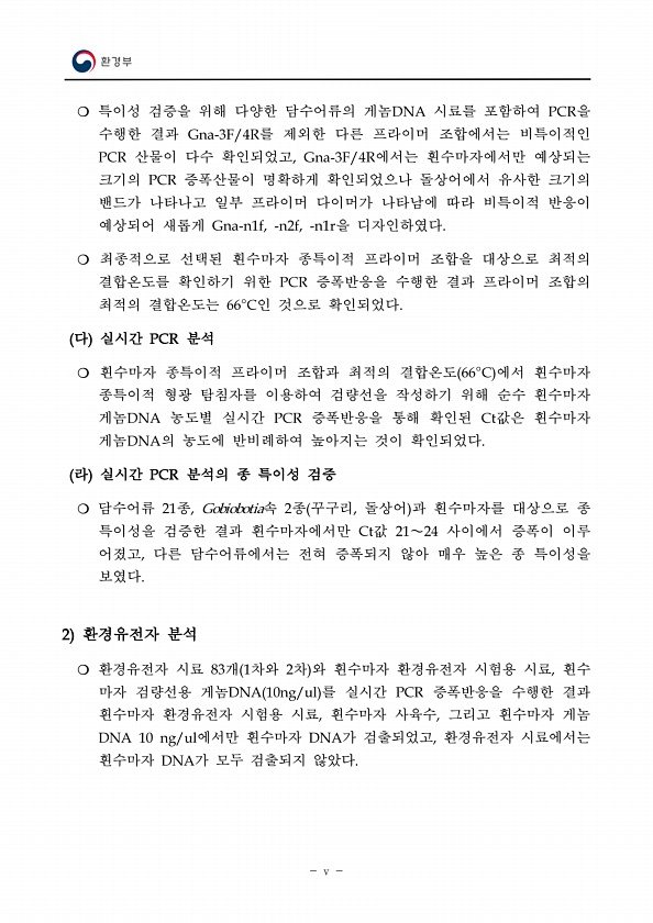 v ? 특이성 검증을 위해 다양한 담수어류의 게놈DNA 시료를 포함하여 PCR을 수행한 결과 Gna-3F/4R를 제외한 다른 프라이머 조합에서는 비특이적인 PCR 산물이 다수 확인되었고, Gna-3F/4R에서는 흰수마자에서만 예상되는 크기의 PCR 증폭산물이 명확하게 확인되었으나 돌상어에서 유사한 크기의 밴드가 나타나고 일부 프라이머 다이머가 나타남에 따라 비특이적 반응이 예상되어 새롭게 Gna-n1f, -n2f, -n1r을 디자인하였다. ? 최종적으로 선택된 흰수마자 종특이적 프라이머 조합을 대상으로 최적의 결합온도를 확인하기 위한 PCR 증폭반응을 수행한 결과 프라이머 조합의 최적의 결합온도는 66°C인 것으로 확인되었다. 다 실시간 PCR 분석 ? 흰수마자 종특이적 프라이머 조합과 최적의 결합온도 66...