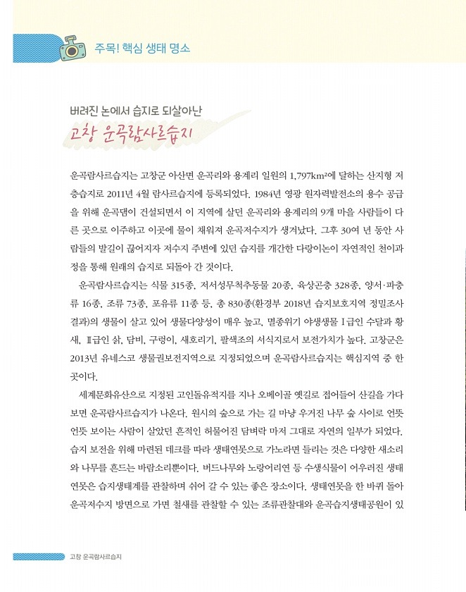 고창 운곡람사르습지 버려진 논에서 습지로 되살아난 고창 운곡람사르습지 운곡람사르습지는 고창군 아산면 운곡리와 용계리 일원의 1,797km2에 달하는 산지형 저 층습지로 2011년 4월 람사르습지에 등록되었다. 1984년 영광 원자력발전소의 용수 공급 을 위해 운곡댐이 건설되면서 이 지역에 살던 운곡리와 용계리의 9개 마을 사람들이 다 른 곳으로 이주하고 이곳에 물이 채워져 운곡저수지가 생겨났다. 그후 30여 년 동안 사 람들의 발길이 끊어지자 저수지 주변에 있던 습지를 개간한 다랑이논이 자연적인 천이과 정을 통해 원래의 습지로 되돌아 간 것이다. 운곡람사르습지는 식물 315종, 저서성무척추동물 20종, 육상곤충 328종, 양서·파충 류 16종, 조류 73종, 포유류 11종 등, 총 830종 환경부 2018년...