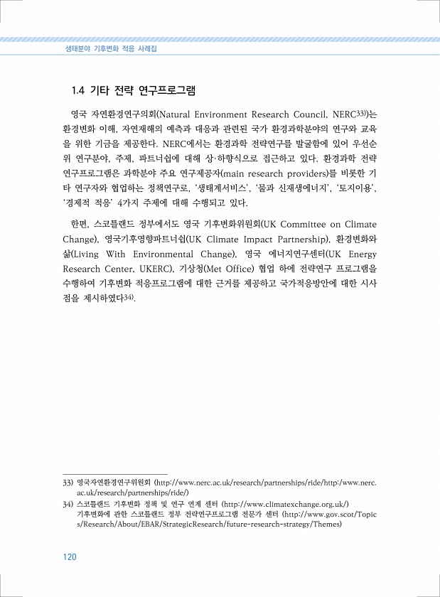 생태분야 기후변화 적응 사례집 120 1.4 기타 전략 연구프로그램 영국 자연환경연구의회 Natural Environment Research Council, NERC33 는 환경변화 이해, 자연재해의 예측과 대응과 관련된 국가 환경과학분야의 연구와 교육 을 위한 기금을 제공한다. NERC에서는 환경과학 전략연구를 발굴함에 있어 우선순 위 연구분야, 주제, 파트너쉽에 대해 상·하향식으로 접근하고 있다. 환경과학 전략 연구프로그램은 과학분야 주요 연구제공자 main research providers 를 비롯한 기 타 연구자와 협업하는 정책연구로, ‘생태계서비스’, ‘물과 신재생에너지’, ‘토지이용’, ‘경제적 적응’ 4가지 주제에 대해 수행되고 있다. 한편, 스코틀랜드 정부에서도 영국 기후변화위원회 UK Com...
