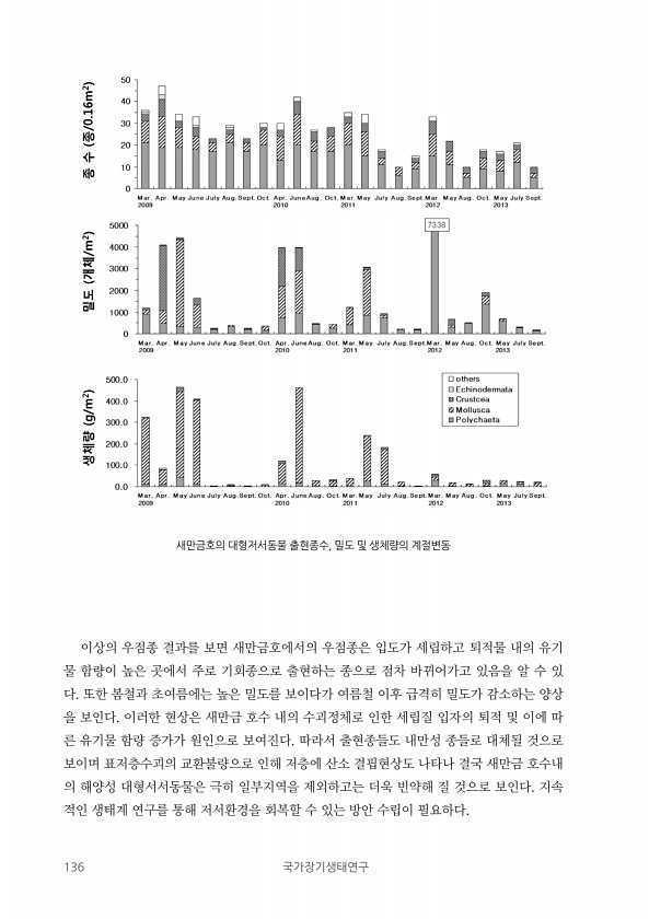 136 국가장기생태연구 이상의 우점종 결과를 보면 새만금호에서의 우점종은 입도가 세립하고 퇴적물 내의 유기 물 함량이 높은 곳에서 주로 기회종으로 출현하는 종으로 점차 바뀌어가고 있음을 알 수 있 다. 또한 봄철과 초여름에는 높은 밀도를 보이다가 여름철 이후 급격히 밀도가 감소하는 양상 을 보인다. 이러한 현상은 새만금 호수 내의 수괴정체로 인한 세립질 입자의 퇴적 및 이에 따 른 유기물 함량 증가가 원인으로 보여진다. 따라서 출현종들도 내만성 종들로 대체될 것으로 보이며 표저층수괴의 교환불량으로 인해 저층에 산소 결핍현상도 나타나 결국 새만금 호수내 의 해양성 대형서서동물은 극히 일부지역을 제외하고는 더욱 빈약해 질 것으로 보인다. 지속 적인 생태계 연구를 통해 저서환경을 회복할 수 있는 방안 수립이 필요...