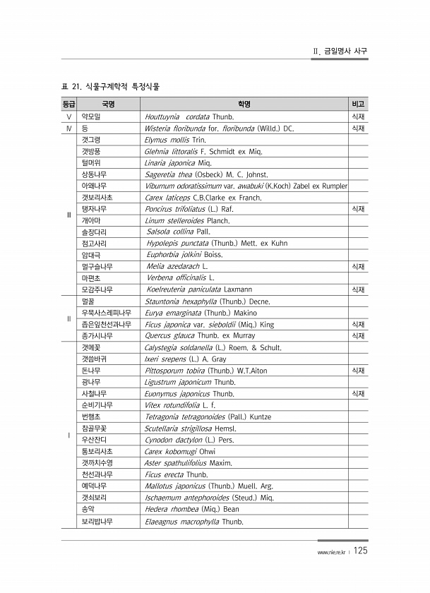 Ⅱ. 금일명사 사구 www.nie.re.kr ? 125 등급 국명 학명 비고 Ⅴ 약모밀 Houttuynia cordata Thunb. 식재 Ⅳ 등 Wisteria floribunda for. floribunda Willd. DC. 식재 Ⅲ 갯그령 Elymus mollis Trin. 갯방풍 Glehnia littoralis F. Schmidt ex Miq. 털머위 Linaria japonica Miq. 상동나무 Sageretia thea Osbeck M. C. Johnst. 아왜나무 Viburnum odoratissimum var. awabuki K.Koch Zabel ex Rumpler 갯보리사초 Carex laticeps C.B.Clarke ex Franch. 탱자나무 Poncirus trifoliatus...