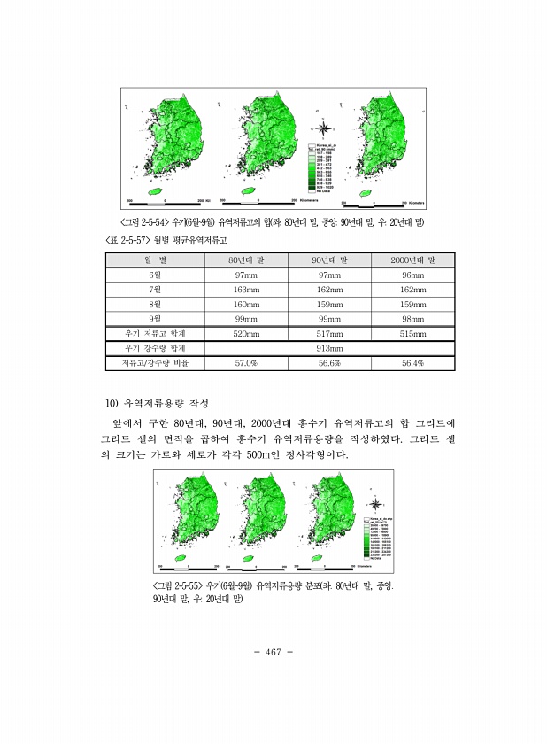 467 그림 2-5-54 우기 6월9월 유역저류고의 합 좌80년대 말, 중앙90년대 말, 우20년대 말 월 별 80년대 말 90년대 말 2000년대 말 6월 97mm 97mm 96mm 7월 163mm 162mm 162mm 8월 160mm 159mm 159mm 9월 99mm 99mm 98mm 우기 저류고 합계 520mm 517mm 515mm 우기 강수량 합계 913mm 저류고/강수량 비율 57.0% 56.6% 56.4% 표 2-5-57 월별 평균유역저류고 10 유역저류용량 작성 앞에서 구한 80년대, 90년대, 2000년대 홍수기 유역저류고의 합 그리드에 그리드 셀의 면적을 곱하여 홍수기 유역저류용량을 작성하였다. 그리드 셀 의 크기는 가로와 세로가 각각 500m인 정사각형이다. 그림 2-5-55 우기 6월9...