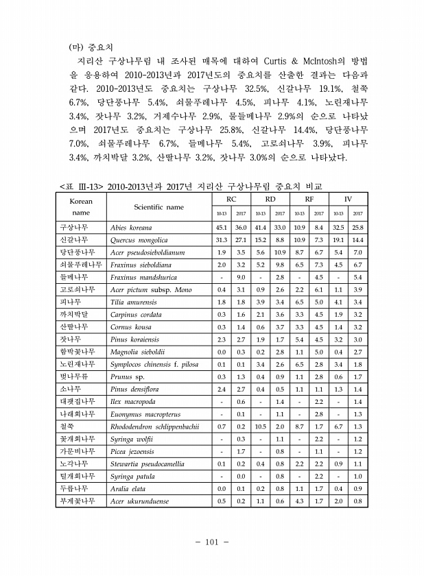 101 마 중요치 지리산 구상나무림 내 조사된 매목에 대하여 Curtis & McIntosh의 방법 을 응용하여 2010-2013년과 2017년도의 중요치를 산출한 결과는 다음과 같다. 2010-2013년도 중요치는 구상나무 32.5%, 신갈나무 19.1%, 철쭉 6.7%, 당단풍나무 5.4%, 쇠물푸레나무 4.5%, 피나무 4.1%, 노린재나무 3.4%, 잣나무 3.2%, 거제수나무 2.9%, 물들메나무 2.9%의 순으로 나타났 으며 2017년도 중요치는 구상나무 25.8%, 신갈나무 14.4%, 당단풍나무 7.0%, 쇠물푸레나무 6.7%, 들메나무 5.4%, 고로쇠나무 3.9%, 피나무 3.4%, 까치박달 3.2%, 산딸나무 3.2%, 잣나무 3.0%의 순으로 나타났다. 표 Ⅲ-13 2010-2013년과...