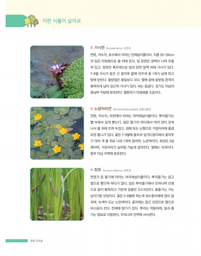 창녕 우포늪 가시연 Euryale ferox 수련과 연못, 저수지, 호수에서 자라는 한해살이풀이다. 지름 20120cm 의 잎은 타원형으로 물 위에 뜬다. 잎 표면은 광택이 나며 주름 져 있고, 뒷면은 흑자색으로 잎의 양면 잎맥 위에 가시가 있다. 78월 가시가 돋은 긴 꽃자루 끝에 자주색 꽃 1개가 낮에 피고 밤에 닫힌다. 꽃받침은 꽃잎보다 크다. 열매 끝에 꽃받침 흔적이 뾰족하게 남아 있으며 가시가 있다. 씨는 둥글다. 경기도 이남의 중남부 지방에 분포한다. 멸종위기 야생생물Ⅱ급이다. 노랑어리연 Nymphoides peltata 조름나물과 연못, 저수지, 하천에서 자라는 여러해살이풀이다. 뿌리줄기는 뻘 속에서 길게 뻗는다. 잎은 줄기의 마디에서 여러 장이 모여 나서 물 위에 뜨며 두껍고, 원형 또는 난형...