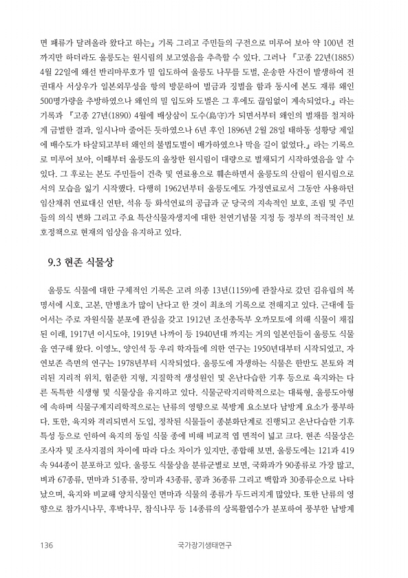 136 국가장기생태연구 면 패류가 달려올라 왔다고 하는』기록 그리고 주민들의 구전으로 미루어 보아 약 100년 전 까지만 하더라도 울릉도는 원시림의 보고였음을 추측할 수 있다. 그러나 『고종 22년 1885 4월 22일에 왜선 반리마루호가 밀 입도하여 울릉도 나무를 도벌, 운송한 사건이 발생하여 전 권대사 서상우가 일본외무성을 항의 방문하여 벌금과 징벌을 함과 동시에 본도 재류 왜인 500명가량을 추방하였으나 왜인의 밀 입도와 도벌은 그 후에도 끊임없이 계속되었다.』라는 기록과 『고종 27년 1890 4월에 배상삼이 도수 島守 가 되면서부터 왜인의 벌채를 철저하 게 금벌한 결과, 일시나마 줄어든 듯하였으나 6년 후인 1896년 2월 28일 태하동 성황당 제일 에 배수도가 타살되고부터 왜인의 불법도벌이 배가하...