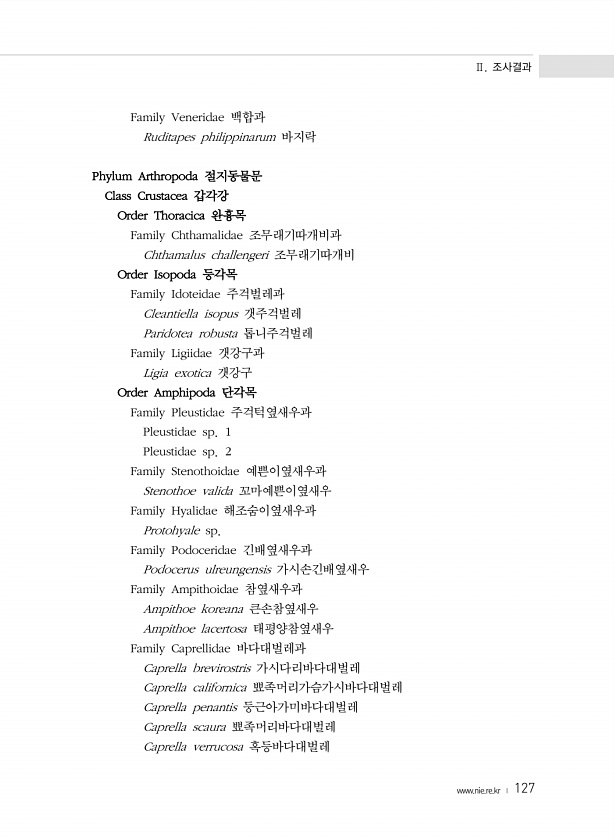 Ⅱ. 조사결과 www.nie.re.kr ? 127 Family Veneridae 백합과 Ruditapes philippinarum 바지락 Phylum Arthropoda 절지동물문 Class Crustacea 갑각강 Order Thoracica 완흉목 Family Chthamalidae 조무래기따개비과 Chthamalus challengeri 조무래기따개비 Order Isopoda 등각목 Family Idoteidae 주걱벌레과 Cleantiella isopus 갯주걱벌레 Paridotea robusta 톱니주걱벌레 Family Ligiidae 갯강구과 Ligia exotica 갯강구 Order Amphipoda 단각목 Family Pleustidae 주걱턱옆새우과 Pleustidae sp. 1 Pleust...