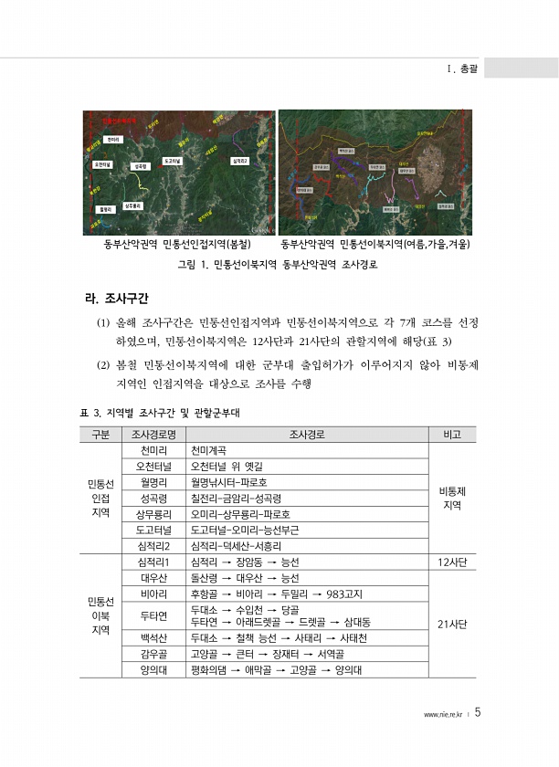 Ⅰ. 총괄 www.nie.re.kr ? 5 동부산악권역 민통선인접지역 봄철 동부산악권역 민통선이북지역 여름,가을,겨울 그림 1. 민통선이북지역 동부산악권역 조사경로 라. 조사구간 1 올해 조사구간은 민통선인접지역과 민통선이북지역으로 각 7개 코스를 선정 하였으며, 민통선이북지역은 12사단과 21사단의 관할지역에 해당 표 3 2 봄철 민통선이북지역에 대한 군부대 출입허가가 이루어지지 않아 비통제 지역인 인접지역을 대상으로 조사를 수행 구분 조사경로명 조사경로 비고 민통선 인접 지역 천미리 천미계곡 비통제 지역 오천터널 오천터널 위 옛길 월명리 월명낚시터-파로호 성곡령 칠전리-금암리-성곡령 상무룡리 오미리-상무룡리-파로호 도고터널 도고터널-오미리-능선부근 심적리2 심적리-덕세산-서흥리 민통선 이북 지역 심적리1...