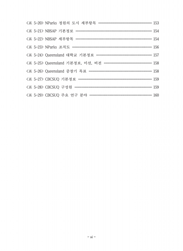 xi 표 5-20 NParks 정원의 도시 세부항목 ·························································153 표 5-21 NBSAP 기본정보 ·················································································154 표 5-22 NBSAP 세부항목 ·················································································154 표 5-23 NParks 조직도 ·····················································································1...