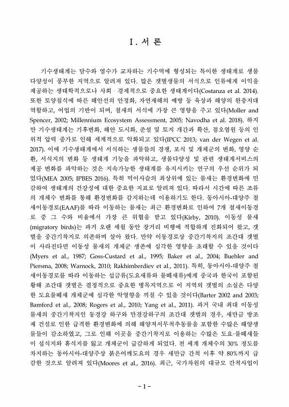 Ⅰ. 서 론 기수생태계는 담수와 염수가 교차하는 기수역에 형성되는 특이한 생태계로 생물 다양성이 풍부한 지역으로 알려져 있다. 많은 갯벌생물의 서식으로 인류에게 이익을 제공하는 생태학적으로나 사회?경제적으로 중요한 생태계이다 Costanza et al. 2014 또한 토양침식에 따른 해안선의 안정화, 자연재해의 예방 등 육상과 해양의 완충지대 역할하고, 어업의 기반이 되며, 철새의 서식에 가장 큰 영향을 주고 있다 Moller and Spencer, 2002; Millennium Ecosystem Assessment, 2005; Navodha et al. 2018 하지 만 기수생태계는 기후변화, 해안 도시화, 준설 및 토지 개간과 확산, 점오염원 등의 인 위적 압력 증가로 인해 세계적으로 악화되고 있다 IP...