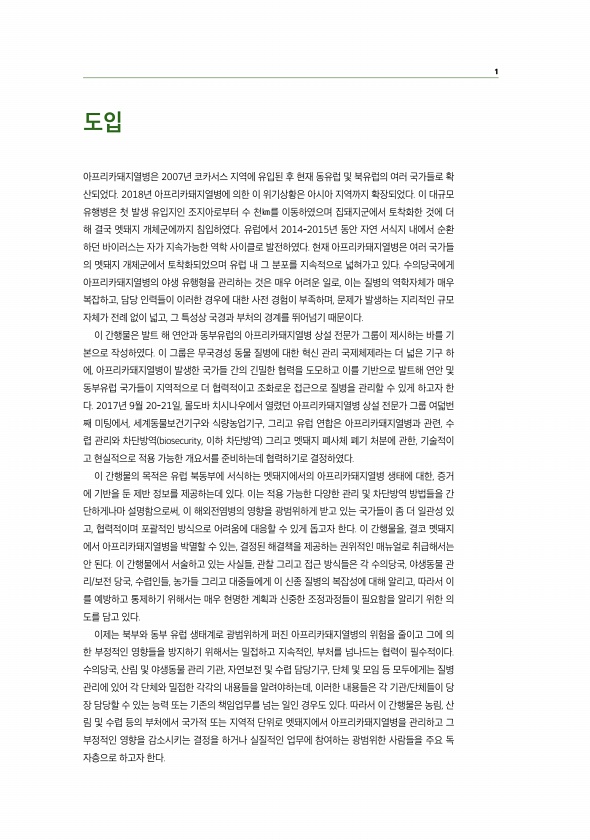 1 도입 아프리카돼지열병은 2007년 코카서스 지역에 유입된 후 현재 동유럽 및 북유럽의 여러 국가들로 확 산되었다. 2018년 아프리카돼지열병에 의한 이 위기상황은 아시아 지역까지 확장되었다. 이 대규모 유행병은 첫 발생 유입지인 조지아로부터 수 천㎞를 이동하였으며 집돼지군에서 토착화한 것에 더 해 결국 멧돼지 개체군에까지 침입하였다. 유럽에서 2014-2015년 동안 자연 서식지 내에서 순환 하던 바이러스는 자가 지속가능한 역학 사이클로 발전하였다. 현재 아프리카돼지열병은 여러 국가들 의 멧돼지 개체군에서 토착화되었으며 유럽 내 그 분포를 지속적으로 넓혀가고 있다. 수의당국에게 아프리카돼지열병의 야생 유행형을 관리하는 것은 매우 어려운 일로, 이는 질병의 역학자체가 매우 복잡하고, 담당 인력들이 이러한 ...