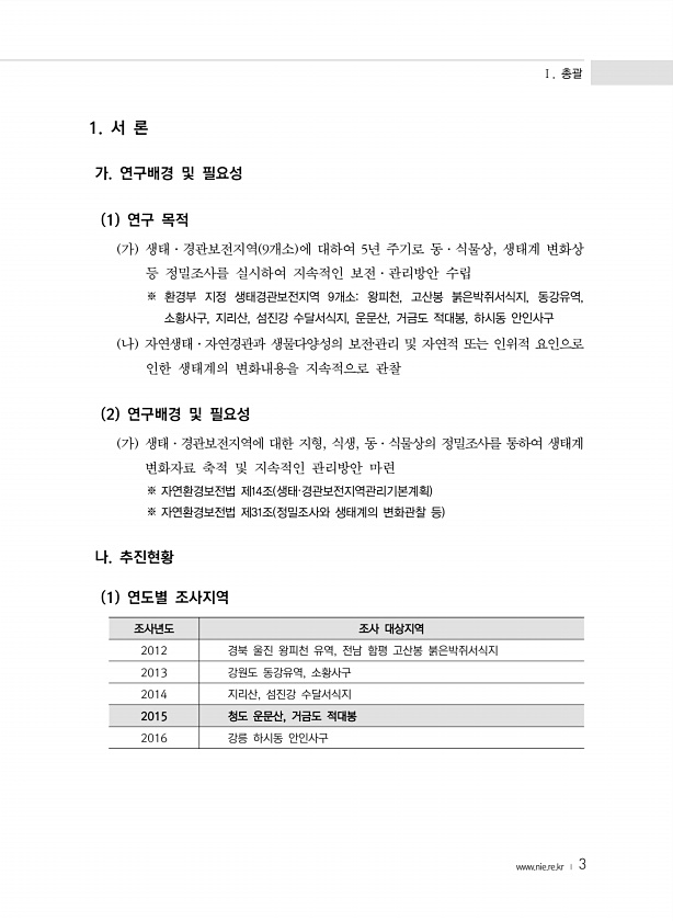 Ⅰ. 총괄 www.nie.re.kr ? 3 1. 서 론 가. 연구배경 및 필요성 1 연구 목적 가 생태·경관보전지역 9개소 에 대하여 5년 주기로 동·식물상, 생태계 변화상 등 정밀조사를 실시하여 지속적인 보전·관리방안 수립 ※ 환경부 지정 생태경관보전지역 9개소왕피천, 고산봉 붉은박쥐서식지, 동강유역, 소황사구, 지리산, 섬진강 수달서식지, 운문산, 거금도 적대봉, 하시동 안인사구 나 자연생태·자연경관과 생물다양성의 보전?관리 및 자연적 또는 인위적 요인으로 인한 생태계의 변화내용을 지속적으로 관찰 2 연구배경 및 필요성 가 생태·경관보전지역에 대한 지형, 식생, 동·식물상의 정밀조사를 통하여 생태계 변화자료 축적 및 지속적인 관리방안 마련 ※ 자연환경보전법 제14조 생태·경관보전지역관리기본계획 ※ 자연환...