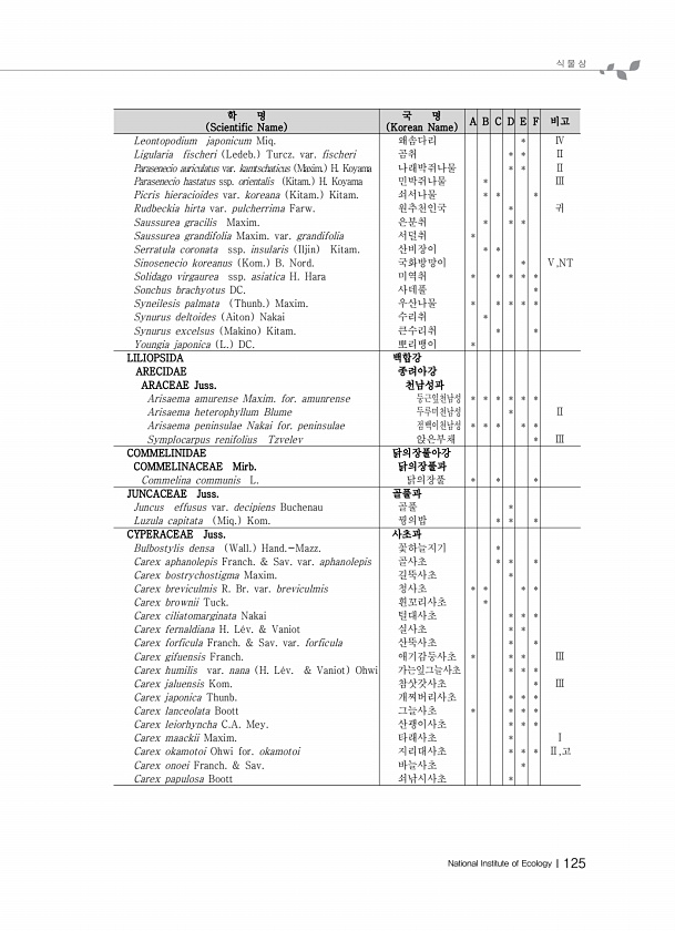 식 물 상 National Institute of EcologyⅠ125 학 명 Scientific Name 국 명 Korean Name A B C D E F 비고 Leontopodium japonicum Miq. 왜솜다리 * Ⅳ Ligularia fischeri Ledeb. Turcz. var. fischeri 곰취 * * Ⅱ Parasenecio auriculatus var. kamtschaticus Maxim. H. Koyama 나래박쥐나물 * * Ⅱ Parasenecio hastatus ssp. orientalis Kitam. H. Koyama 민박쥐나물 * Ⅲ Picris hieracioides var. koreana Kitam. Kitam. 쇠서나물 * * * Rudbeckia hirta var. ...