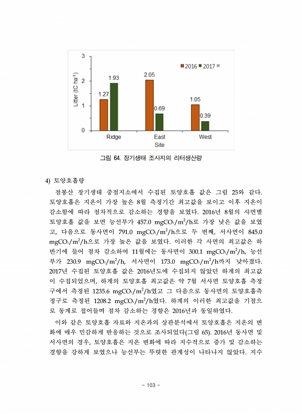 그림 64. 장기생태 조사지의 리터생산량 4 토양호흡량 점봉산 장기생태 중점지소에서 수집된 토양호흡 값은 그림 25와 같다. 토양호흡은 지온이 가장 높은 8월 측정기간 최고값을 보이고 이후 지온이 감소함에 따라 점차적으로 감소하는 경향을 보였다. 2016년 8월의 사면별 토양호흡 값을 보면 능선부가 457.0 mgCO2/m2/h로 가장 낮은 값을 보였 고, 다음으로 동사면이 791.0 mgCO2/m2/h으로 두 번째, 서사면이 845.0 mgCO2/m2/h으로 가장 높은 값을 보였다. 이러한 각 사면의 최고값은 하 반기에 들어 점차 감소하여 11월에는 동사면이 300.1 mgCO2/m2/h, 능선 부가 230.9 mgCO2/m2/h, 서사면이 173.0 mgCO2/m2/h까지 낮아졌다. 2017년 수집된 토...