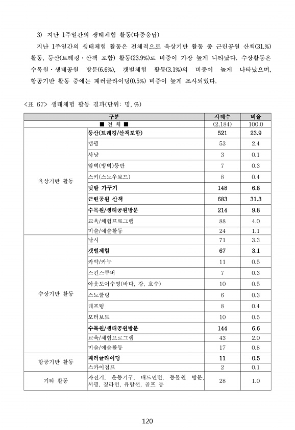 120 3 지난 1주일간의 생태체험 활동 다중응답 지난 1주일간의 생태체험 활동은 전체적으로 육상기반 활동 중 근린공원 산책 31.% 활동, 등산 트레킹·산책 포함 활동 23.9% 로 비중이 가장 높게 나타났다. 수상활동은 수목원·생태공원 방문 6.6% , 갯벌체험 활동 3.1% 의 비중이 높게 나타났으며, 항공기반 활동 중에는 패러글라이딩 0.5% 비중이 높게 조사되었다. 표 67 생태체험 활동 결과 단위명, % 구분 사례수 비율 ■ 전 체 ■ 2,184 100.0 육상기반 활동 등산 트레킹/산책포함 521 23.9 캠핑 53 2.4 사냥 3 0.1 암벽 빙벽 등반 7 0.3 스키 스노우보드 8 0.4 텃밭 가꾸기 148 6.8 근린공원 산책 683 31.3 수목원/생태공원방문 214 9.8 교육/체험프로...