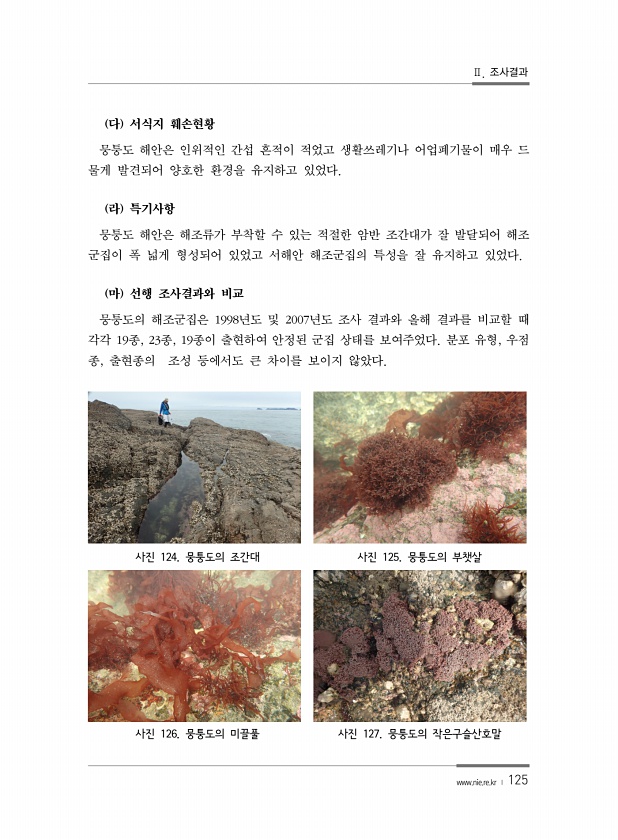 Ⅱ. 조사결과 www.nie.re.kr ? 125 다 서식지 훼손현황 뭉퉁도 해안은 인위적인 간섭 흔적이 적었고 생활쓰레기나 어업폐기물이 매우 드 물게 발견되어 양호한 환경을 유지하고 있었다. 라 특기사항 뭉퉁도 해안은 해조류가 부착할 수 있는 적절한 암반 조간대가 잘 발달되어 해조 군집이 폭 넓게 형성되어 있었고 서해안 해조군집의 특성을 잘 유지하고 있었다. 마 선행 조사결과와 비교 뭉퉁도의 해조군집은 1998년도 및 2007년도 조사 결과와 올해 결과를 비교할 때 각각 19종, 23종, 19종이 출현하여 안정된 군집 상태를 보여주었다. 분포 유형, 우점 종, 출현종의 조성 등에서도 큰 차이를 보이지 않았다. 사진 124. 뭉퉁도의 조간대 사진 125. 뭉퉁도의 부챗살 사진 126. 뭉퉁도의 미끌풀 사진 ...