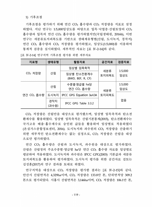 1 기후조절 기후조절을 평가하기 위해 연간 CO2 흡수량과 CO2 저장량을 지표로 설정 하였다. 지난 연구는 15,000임상도를 바탕으로 입목·낙엽층·산림토양의 CO2 흡수량과 입목의 연간 CO2 흡수량을 평가하였지만 국립생태원, 2016b , 이번 연구는 세분류토지피복도를 기반으로 생태계유형별 산림, 도시녹지, 경작지 연간 CO2 흡수량과 CO2 저장량을 평가하였고, 임상도 15,000 를 이용하여 통계적 검증을 실시하였다. 세부적인 자료는 [표 Ⅳ-2-14]와 같다. 지표명 생태유형 활동자료 공간자료 검증자료 CO2 저장량 산림 임상별 임목축적 세분류 토지피복도 15,000 임상별 탄소전환계수 임상도 BWD, BEF, R, CF 연간 CO2 흡수량 산림 수종별·영급별 ha당 연간 CO2 흡수량 세분류 토...