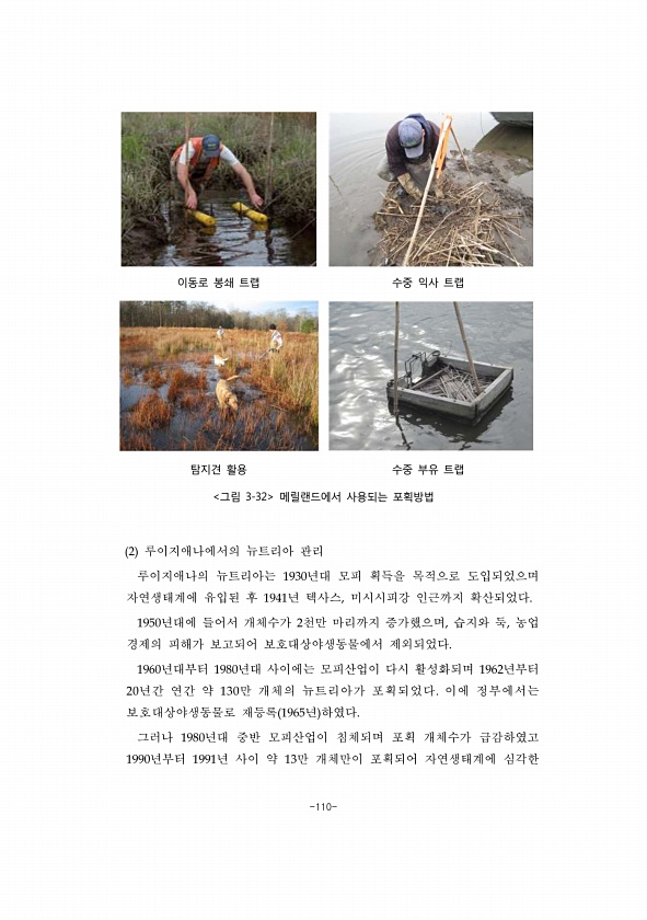 -110- 이동로 봉쇄 트랩 수중 익사 트랩 탐지견 활용 수중 부유 트랩 그림 3-32 메릴랜드에서 사용되는 포획방법 2 루이지애나에서의 뉴트리아 관리 루이지애나의 뉴트리아는 1930년대 모피 획득을 목적으로 도입되었으며 자연생태계에 유입된 후 1941년 텍사스, 미시시피강 인근까지 확산되었다. 1950년대에 들어서 개체수가 2천만 마리까지 증가했으며, 습지와 둑, 농업 경제의 피해가 보고되어 보호대상야생동물에서 제외되었다. 1960년대부터 1980년대 사이에는 모피산업이 다시 활성화되며 1962년부터 20년간 연간 약 130만 개체의 뉴트리아가 포획되었다. 이에 정부에서는 보호대상야생동물로 재등록 1965년 하였다. 그러나 1980년대 중반 모피산업이 침체되며 포획 개체수가 급감하였고 1990년부터 199...